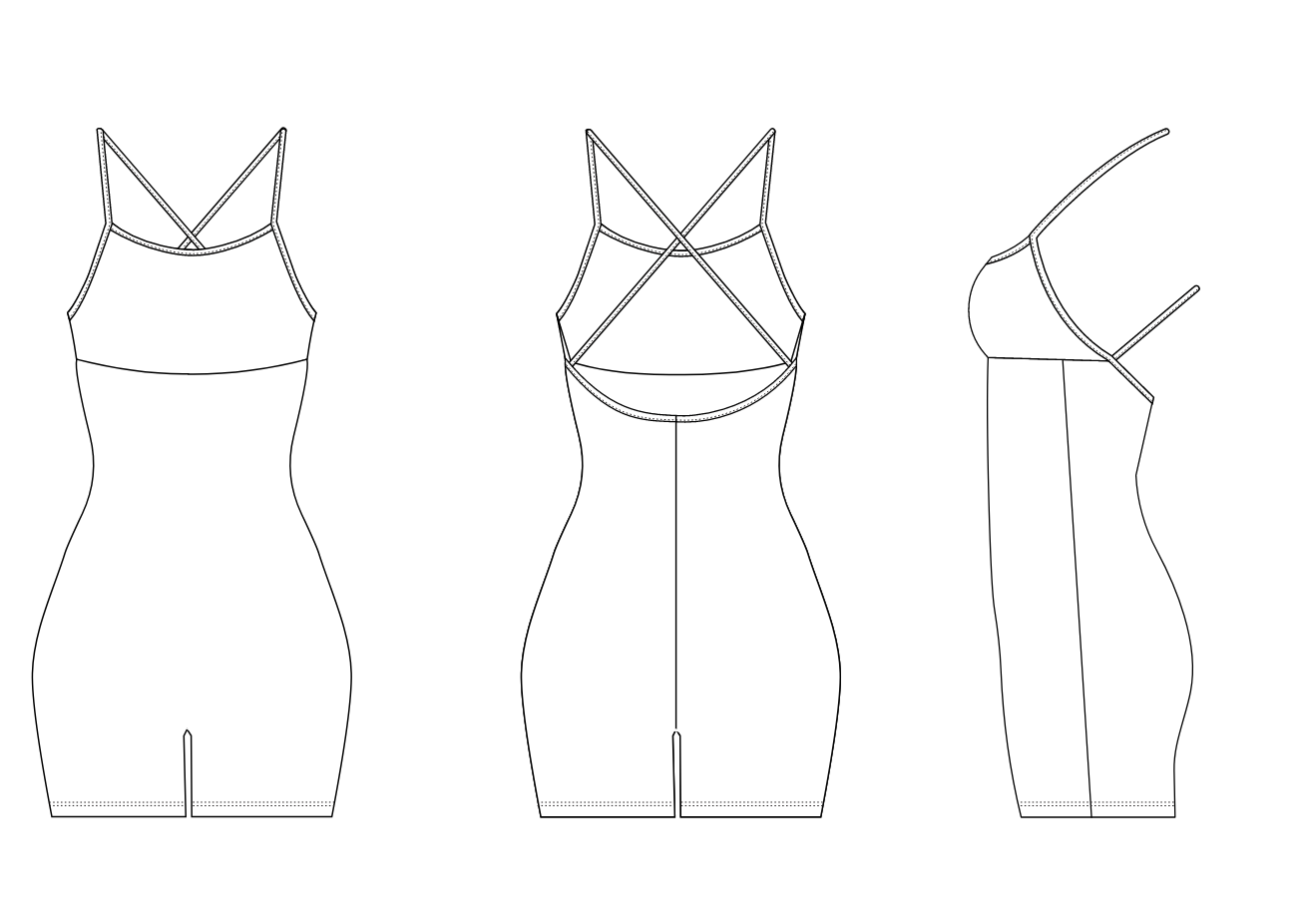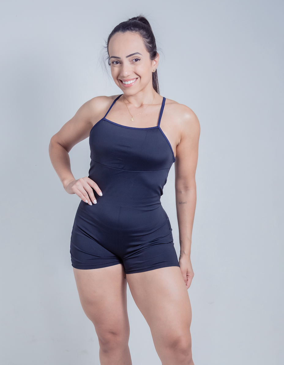 Modelo com costas aberta, alça cruzada, recorte abaixo do busto, sem costura no gancho da frente
