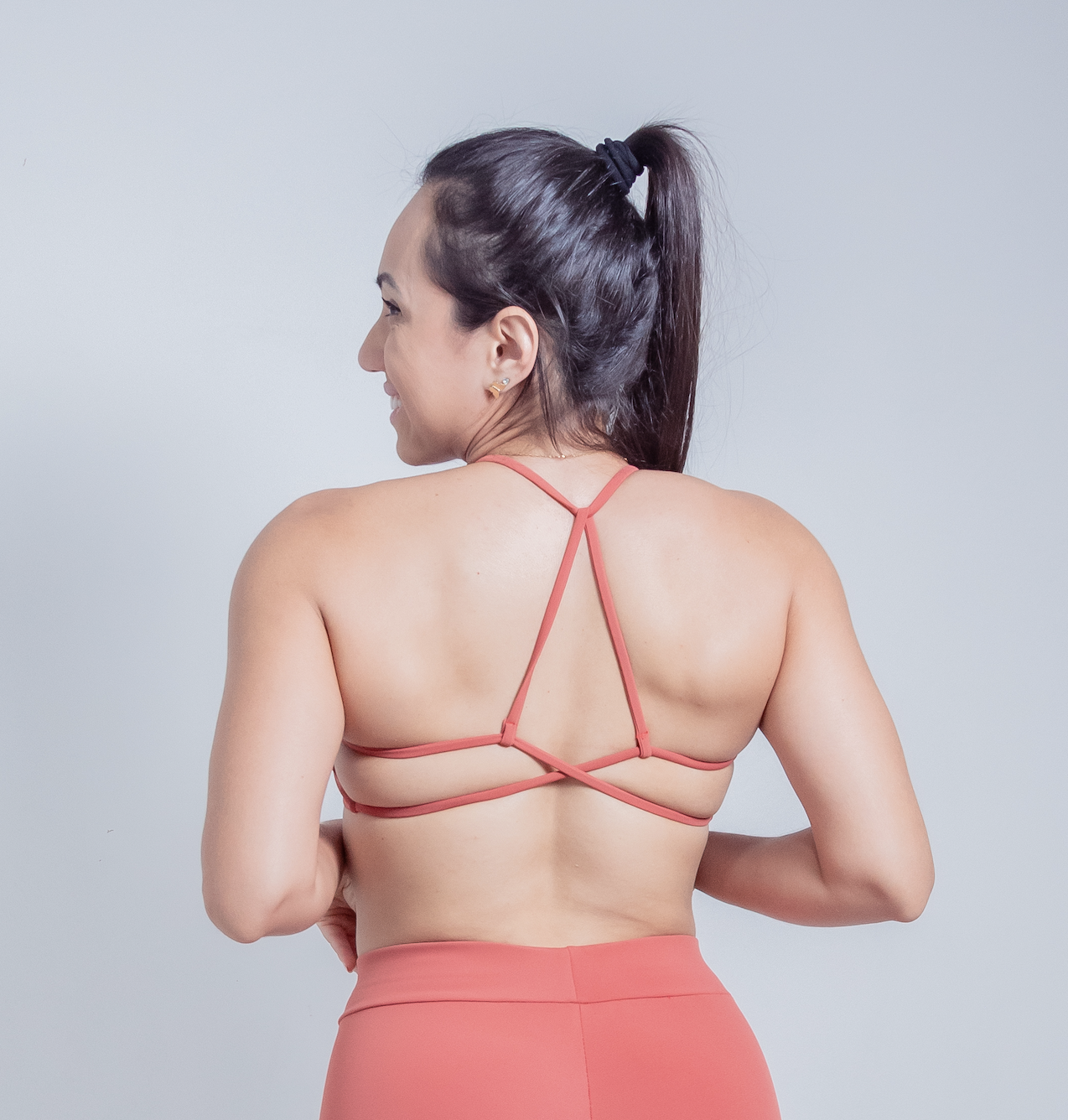 Modelo frente única com alças finas nas costas retas e cruzadas