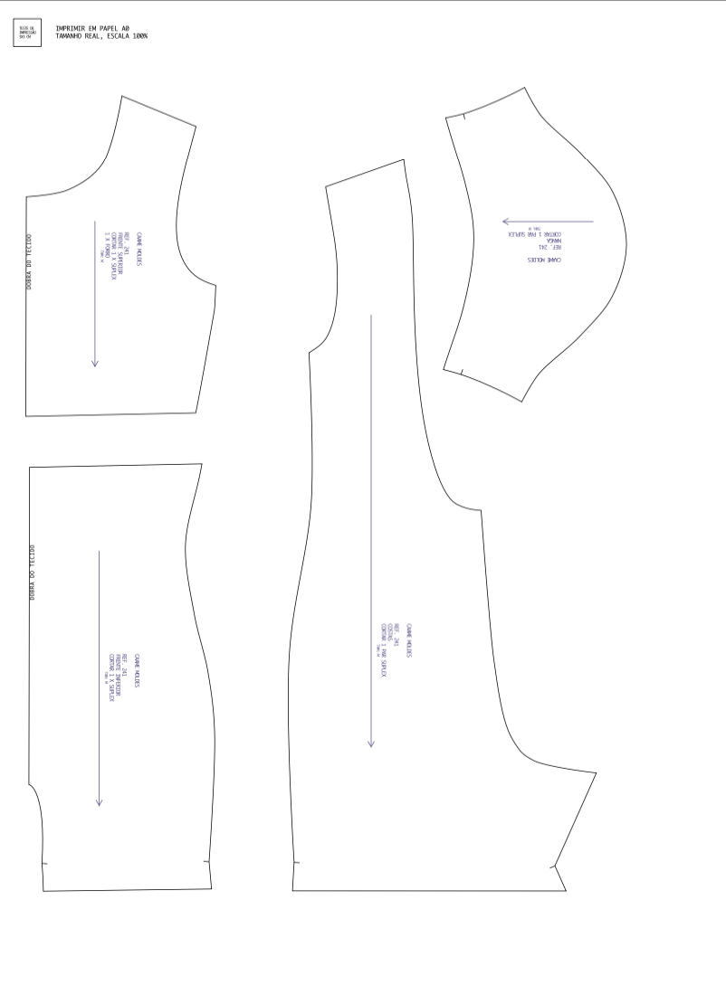 *Moldes riscados dobrados (com indicação de dobra do tecido).