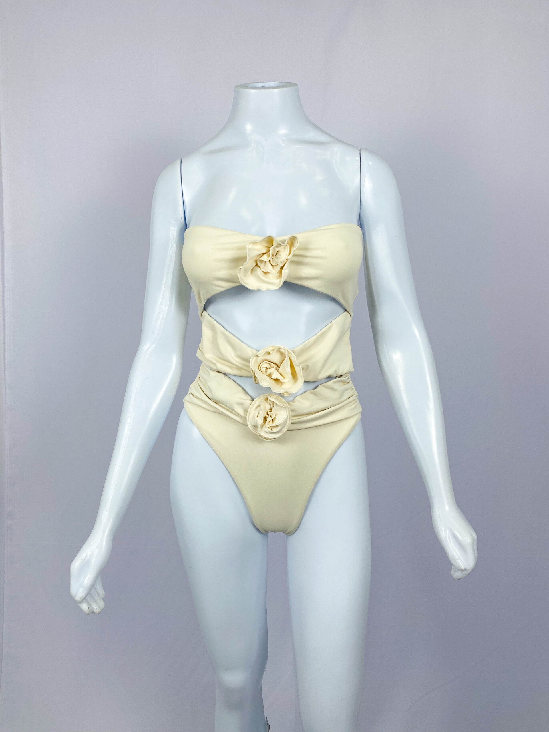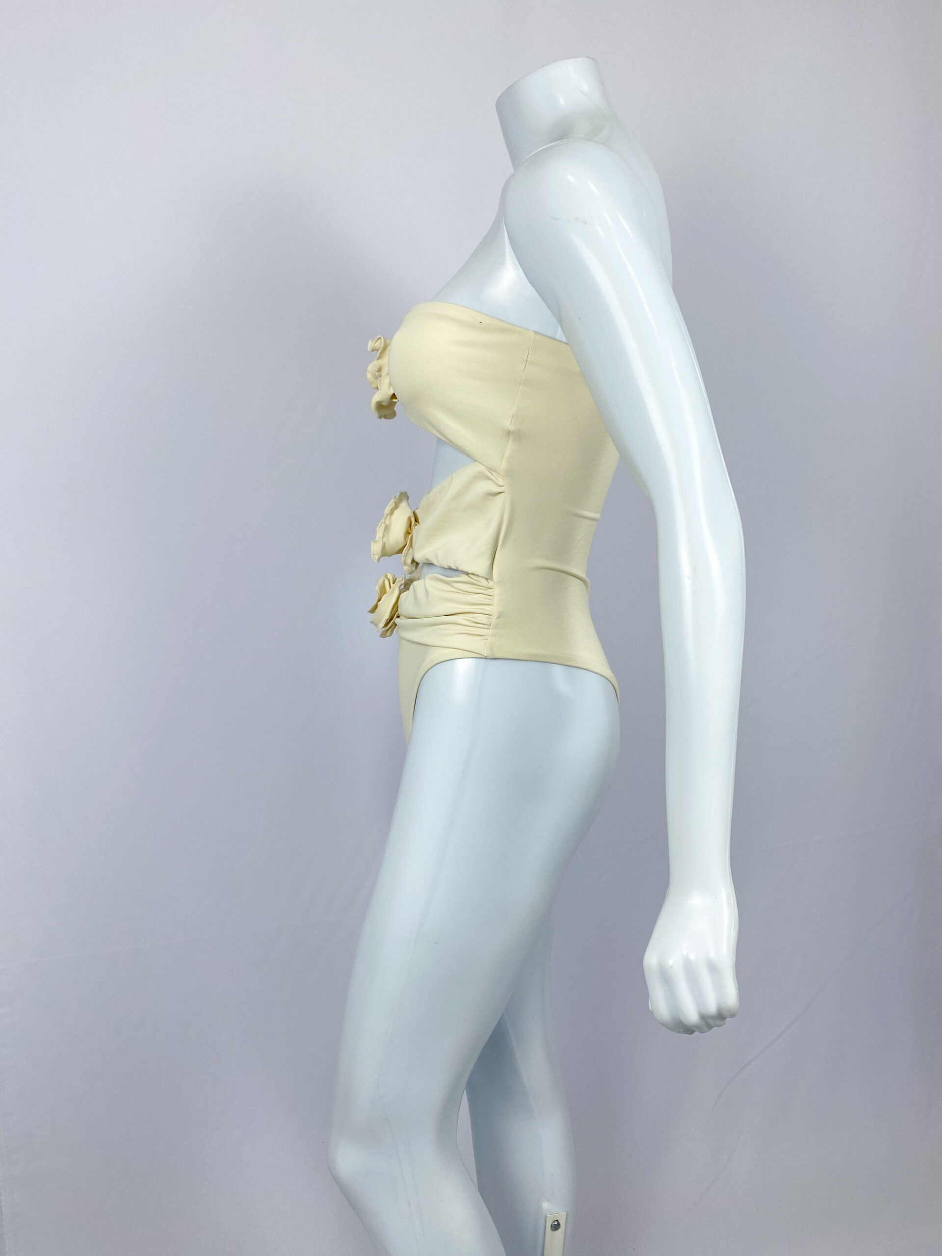 MAIÔ SEM ALÇAS COM RECORTES E APLICAÇÃO DE FLORES