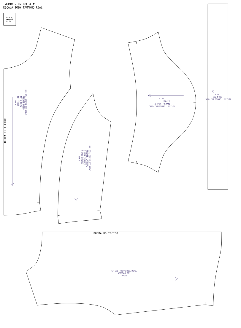 *Moldes riscados dobrados (com indicação de dobra do tecido).